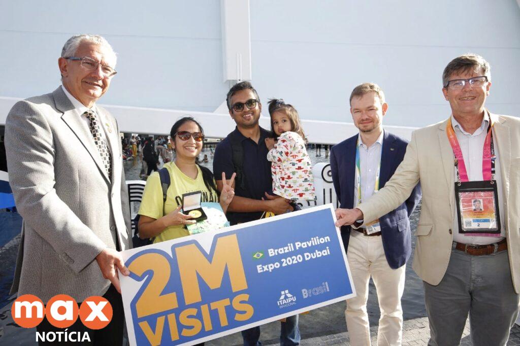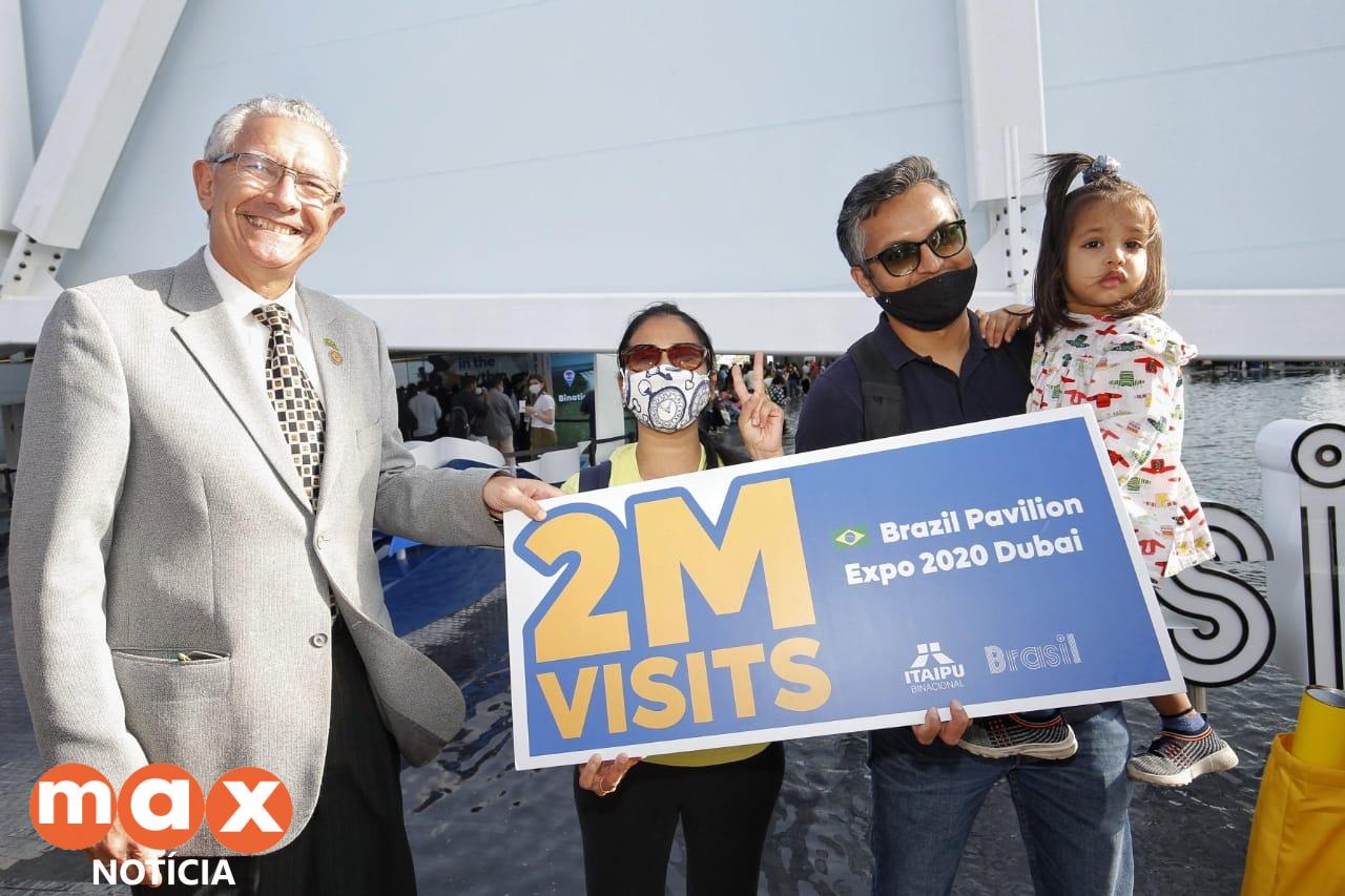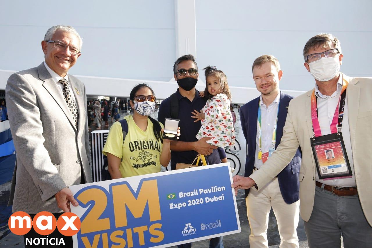 Em uma exposição mundial influenciada por incertezas da pandemia de covid-19, o Pavilhão Brasil comemorou nesta terça-feira (29) a marca de 2 milhões de visitantes. O número foi atingido com a chegada do casal indiano Sudha Toshniwal e Sharad Lahoti, acompanhado da filha Saiesha, de três anos de idade. Eles compareceram para a exposição da Itaipu Binacional sobre os cuidados com a água.