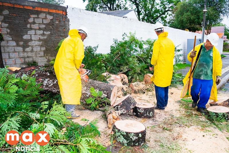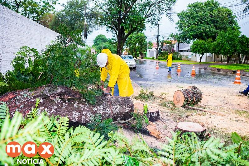 Equipes da Defesa Civil e Copel estão nas ruas da cidade fazendo reparos dos prejuízos em vias públicas. Na região central, na Rua Tarobá, em frente a sede do Sismufi, o vento forte derrubou uma árvore de grande porte. O tronco e galhos ficaram atravessados na via, prejudicando o trânsito. Além disso, os galhos atingiram a fiação elétrica, o que causou o desligamento de energia de residências e empresas nas proximidades.