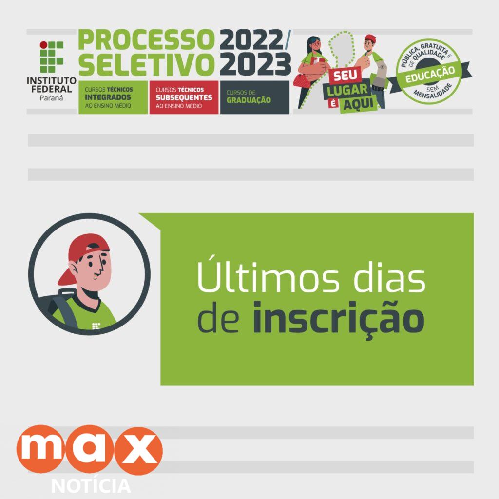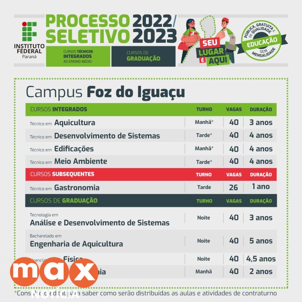 Os interessados em estudar no Instituto Federal do Paraná (IFPR) podem realizar inscrição para participar do Processo Seletivo 2022/2023 até as 16h desta quinta-feira, 29 de setembro. O certame visa selecionar candidatos para os cursos técnicos e de graduação gratuitos. O Campus Foz do Iguaçu oferece 346 cursos presenciais com início no primeiro semestre de 2023.