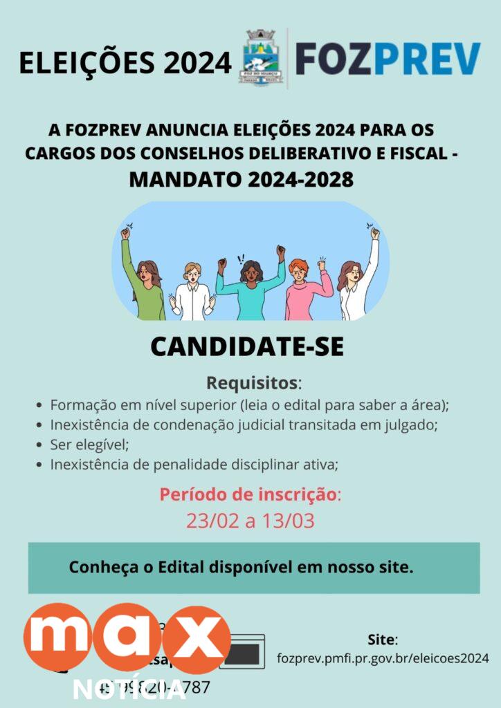 Servidores ativos e aposentados podem se candidatar dos dias 23/02 a 13/03, através do site: www.fozprev.pmfi.pr.gov.br/eleicoes2024